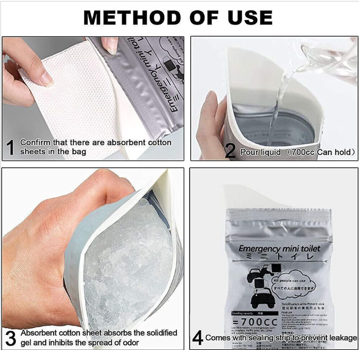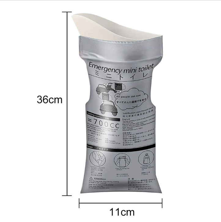 每個包裝袋均配有密封條,完全密封,不會洩漏,無異味。 尿袋容量約為700毫升,足以應付緊急情況。