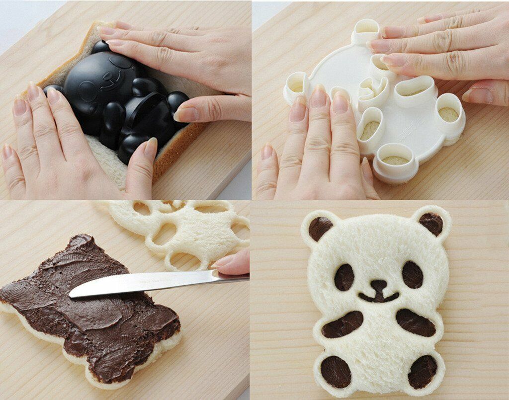 - 它還可以幫助您製作美味的三明治,簡單、簡單、可愛。 切刀可以幫助您將方形麵包切成熊貓形狀的三明治。 你可以用任何你喜歡的東西來填充它。