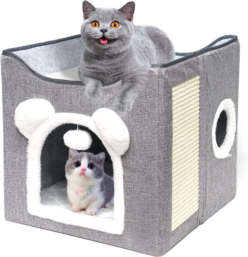 大型貓貓屋貓床可摺疊室內,貓洞帶貓抓墊,適合所有季節,蓬鬆球懸掛迷你孔貓公寓