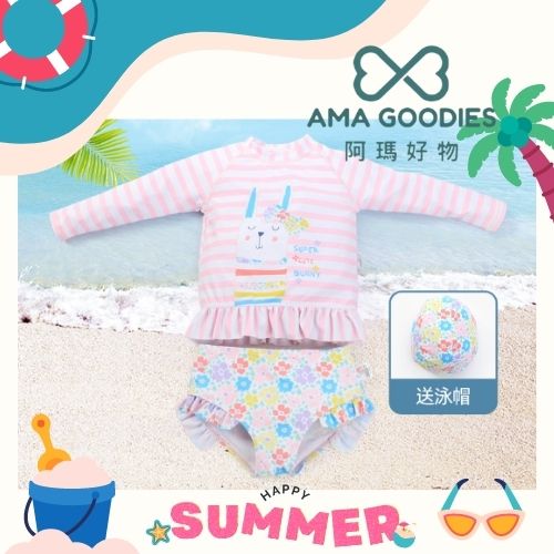 AMSW002P 粉紅小兔分體防曬泳衣(附送泳帽) 80-120 | 小公主必愛