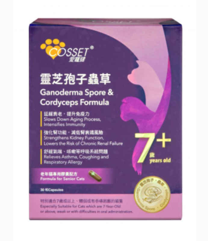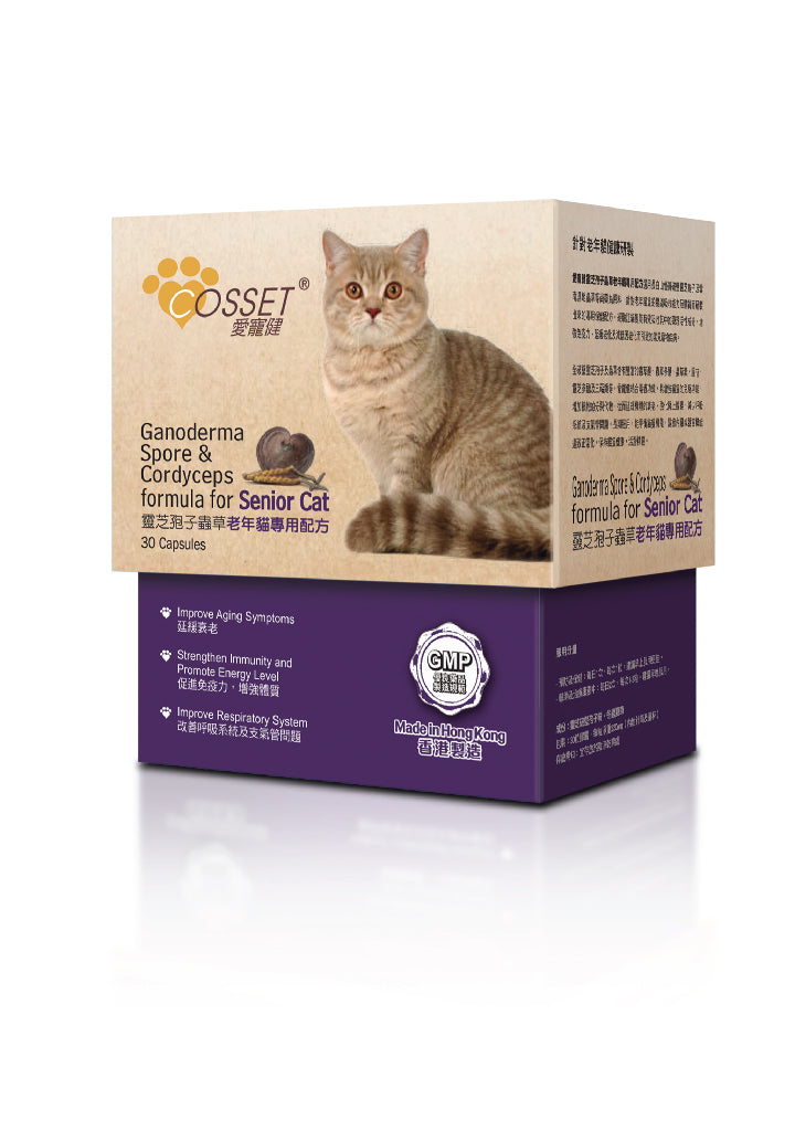 經長時間開發,配方特別為老年貓度身訂造。針對性按照老年貓腸道吸收能力、體質和分解藥物的困難,特意選用優質靈芝孢子及冬蟲夏草為原料的老貓保健配方。貓隻能有效吸收配方成分,增強免疫力、改善腎功能、延緩衰老及減低因衰老或免疫力下降而患上常見疾病的風險。