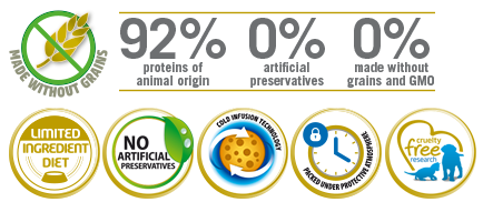新鮮無骨鴨(18%),脫水鴨(18%),豌豆澱粉,鯡魚油,藜麥種子(8%),亞麻籽,幹椰子(2.5%),薑黃(2.5%),菊粉,低聚果糖,酵母提取物(甘露寡糖的來源),碳酸鈣,磷酸二鈣,洋車前子,氯化鉀,鹽,啤酒酵母幹酵母,氨基葡萄糖,硫酸軟骨素,維生素A補充劑,維生素D3補充劑,維生素E補充劑,抗壞血酸,菸酸,泛酸鈣,核黃素,鹽酸吡哆醇,硫酸單胺,生物素,葉酸,維生素B12補充劑,氯化膽鹼,β-胡蘿蔔素,蛋氨酸鋅羥基類似物螯合物,甲硫氨酸羥基類似物螯合物,甘氨酸亞鐵,蛋氨酸羥基類似物螯合物,硒酵母,DL-蛋氨酸,牛磺酸,左旋肉鹼,蘆薈凝膠濃縮液,綠茶提取物,迷迭香提取物,混合生育酚(一種天然防腐劑)。