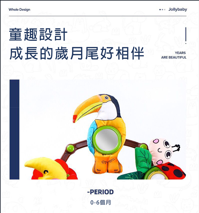 Jollybaby 大嘴鳥床夾是一款專為初生嬰兒設計的多功能安撫掛件,可夾在嬰兒床、手推車或遊戲區,陪伴 BB 進行感官探索、視覺追蹤與早期觸覺學習。產品包含多款可愛小夥伴:彎月、巨嘴鳥、瓢蟲、葉子角色,每一款都有不同材質與小驚喜,刺激 BB 的視覺、聽覺與觸覺發展。
