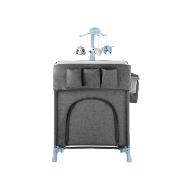 9. 嬰兒床附有床墊(尺寸:120x60(厘米), 旋轉木馬玩具, 學習站立手柄, 尿片架, 換尿片台, 收納袋和蚊帳